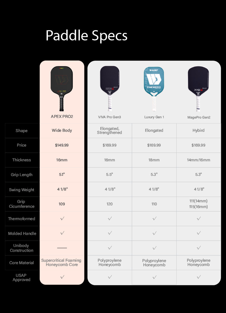 It offers a sublime, soft touch for delicate dinks and resets at the kitchen line, but when you step up to drive, you'll feel the explosive power and hear that decisive pop. Built with a wide-body shape and a balanced, mid-weight feel (8.2-8.4 oz), the Apex Pro2 feels fast in your hand and guarantees a massive, forgiving sweet spot for confident, all-court play.