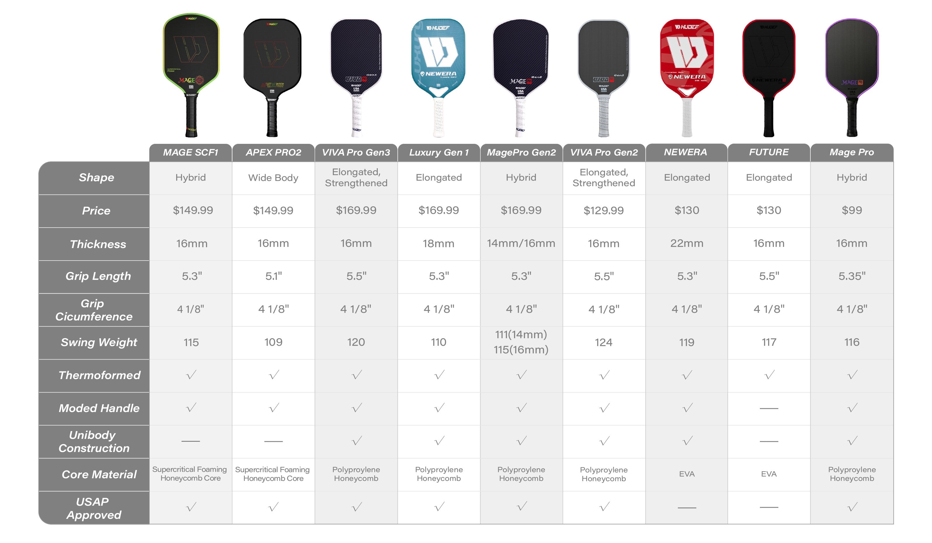 It offers exceptional touch for soft dinks at the kitchen line, yet when you load up for a drive or serve with spin, you'll unleash explosive power that leaves opponents scrambling. Built with a hybrid shape and available in two weight options (8.0-8.2 oz Standard | 8.21-8.4 oz Pro), the Mage SCF1 feels nimble while providing a generous sweet spot for confident play from baseline to net.